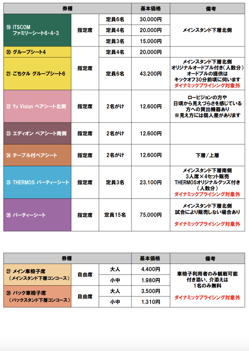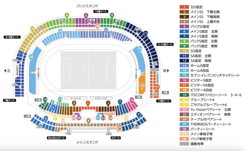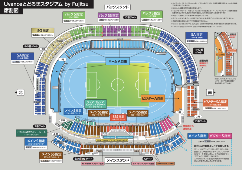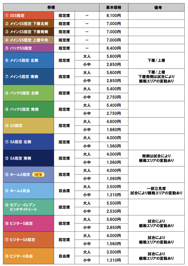 - 部分席種,再細分為南北側販售:メインSS指定、メインS指定、バックS指定、SA指定