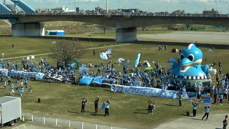 238名支持者聚集在多摩川河川敷,向東急線電車揮旗約一小時,呼籲球迷前往3/22 MUFG國立觀戰。