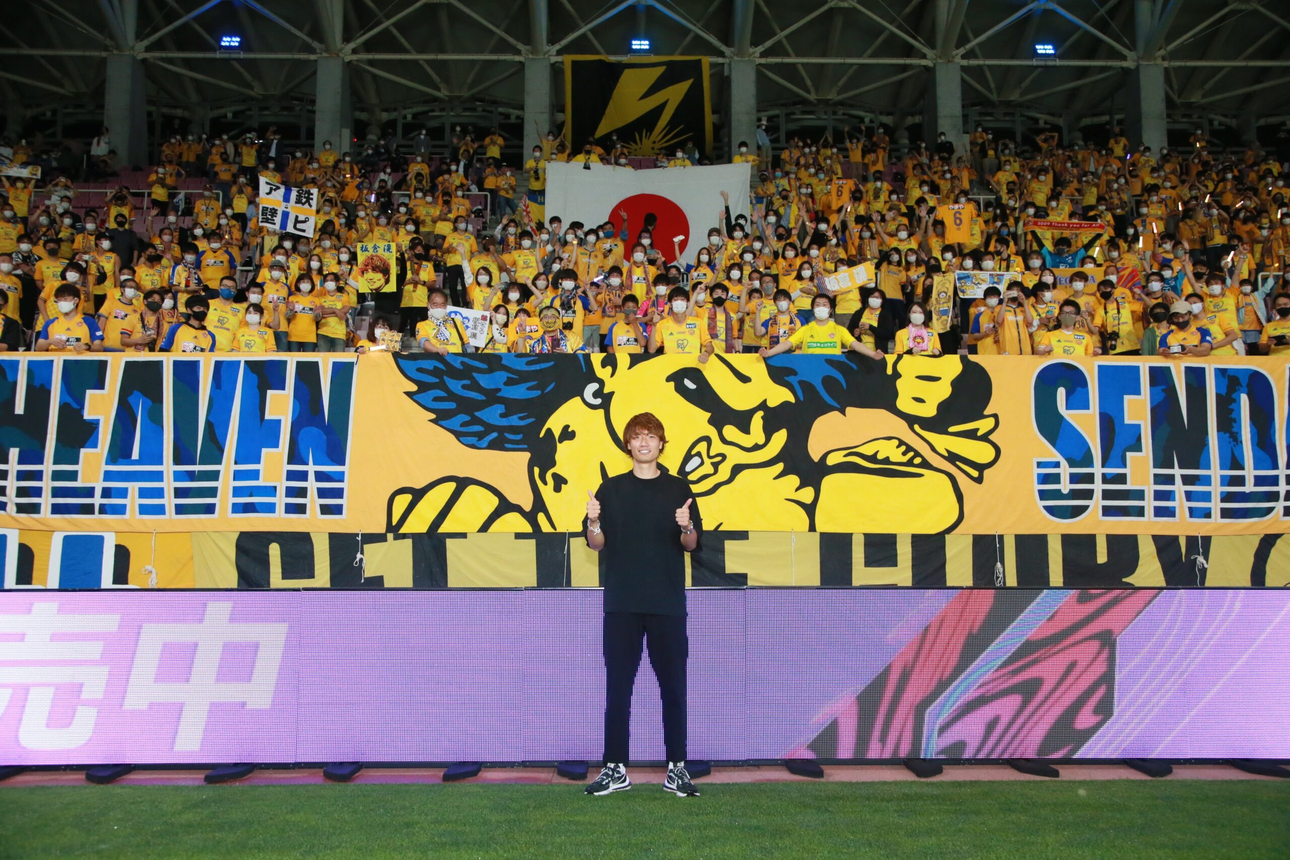 荷甲賽季結束返國準備參加奧運的板倉滉,可是川崎全隊上下都在烏茲別克,所以阿滉沒得回到等等力跟大家打招呼,倒是受到仙台維泰加邀請,回到仙台(2018租借)Yurtec球場與仙台球迷打招呼。(2021 J1第21節 仙台0-0浦和)