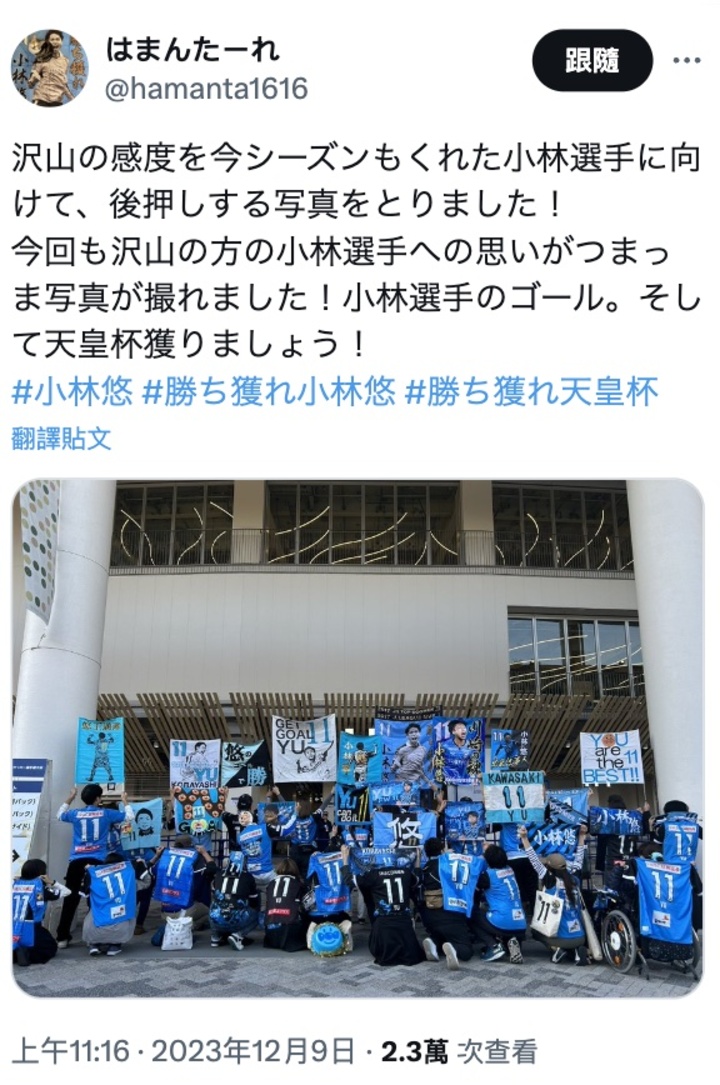 而後發現這個推主非常有名氣,日前川崎前鋒的youtube執行了嚇嚇死忠球迷的企劃時,STAFF選了這位推主,小林悠一看到推主的影片,就說他記得這個球迷,光聽到企劃時就想到可能會找這個人,當年傳出轉會時,這位球迷去看練習時看到小林悠便哭著說希望他別走,會一直為他加油,讓小林悠印象深刻。