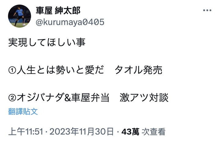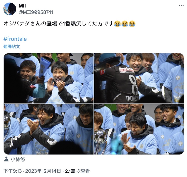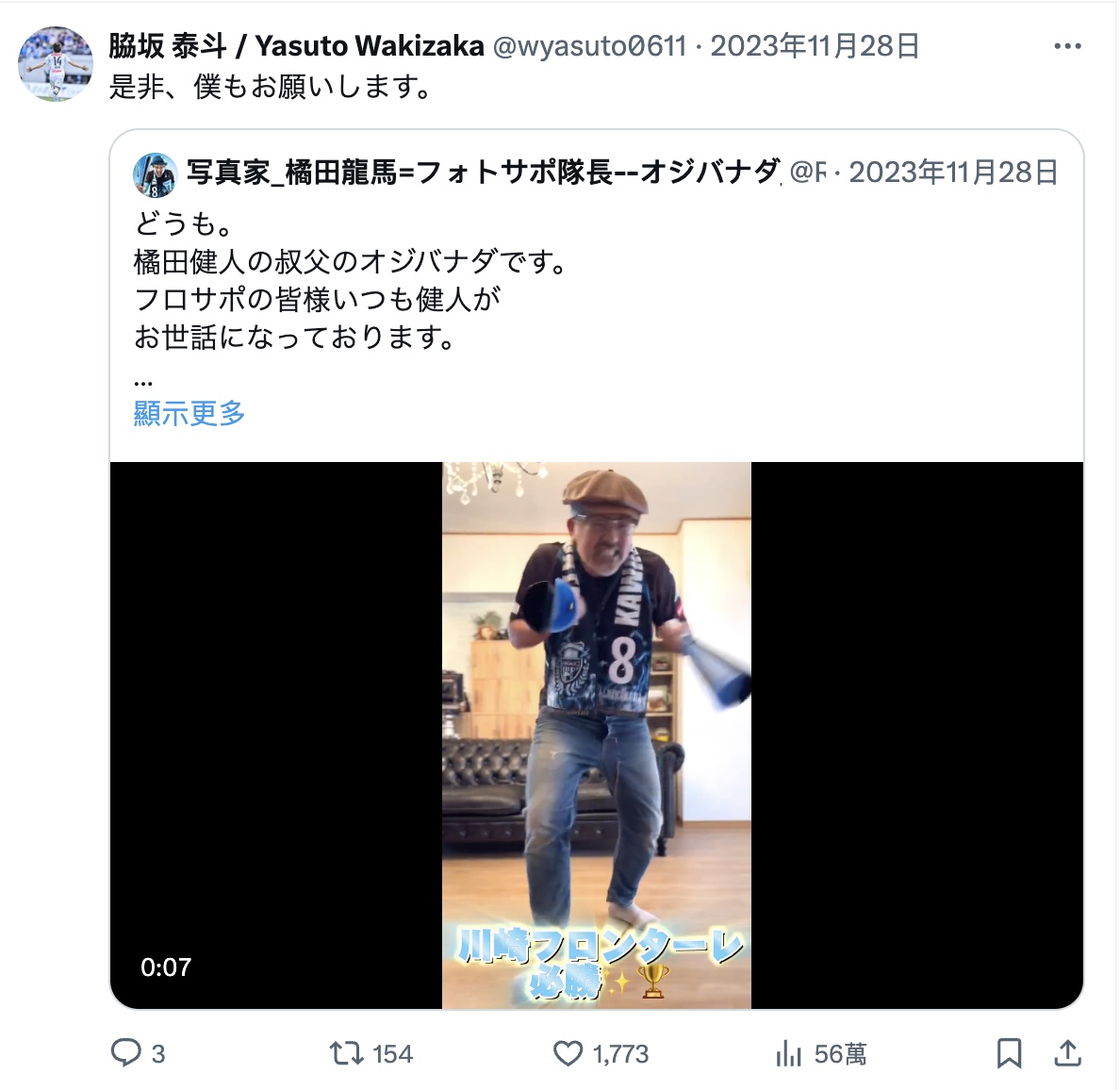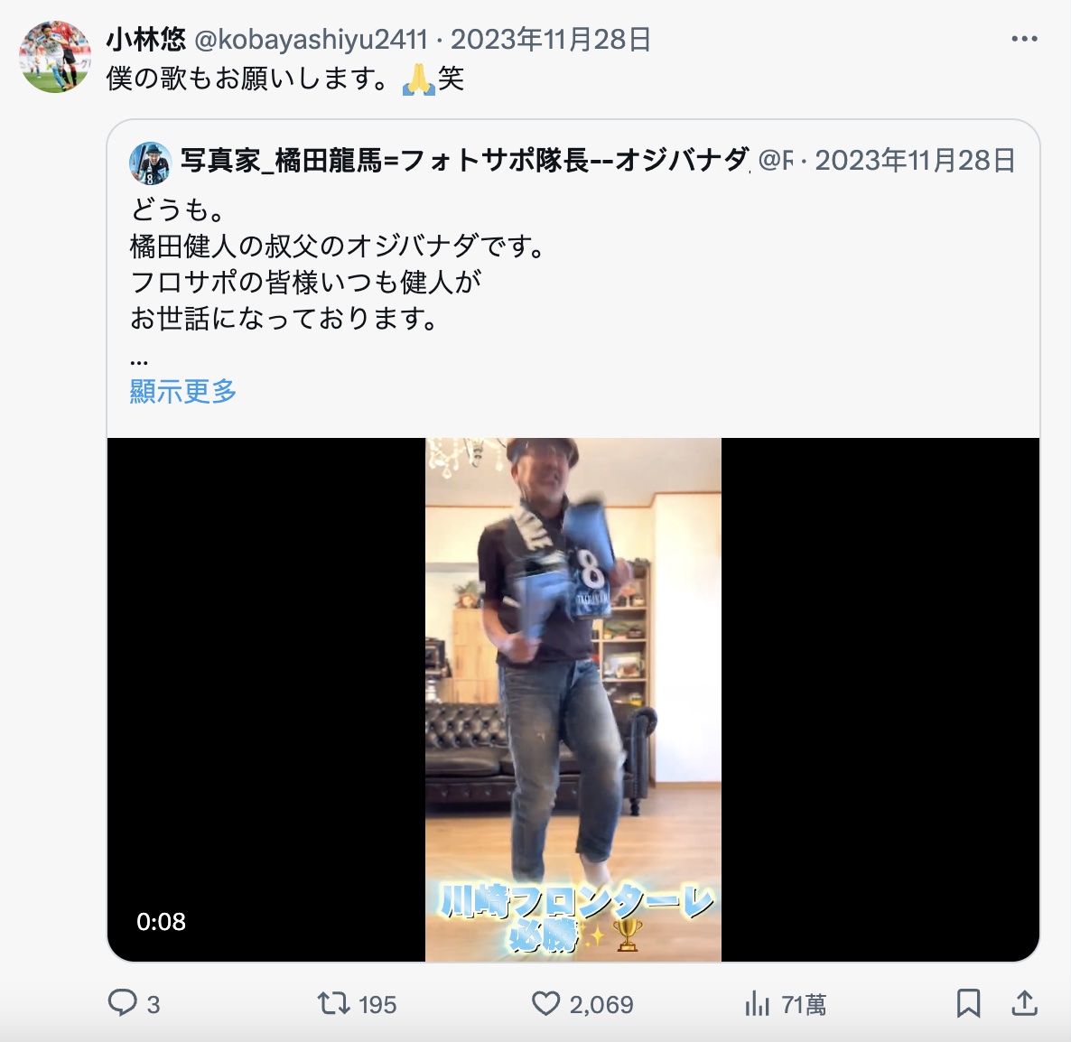 所以從11月24日開始,叔父就在推特上面開始發布影片,內容都是感謝球迷、為橘田打氣的熱血載歌載舞,叔父的自我放飛與內斂到有點影薄的橘田呈現極大的反差衝擊,加上川崎在收官時戰績稍有起色以及打入天皇杯決賽的歡喜,立刻引發球迷的大量轉發,叔父本著對橘田的愛,除了橘田的應援曲外,也唱起了為球迷打氣的應援曲,連球員都注意到了,脇坂泰斗、小林悠立刻轉發,然後吵著說我也要!